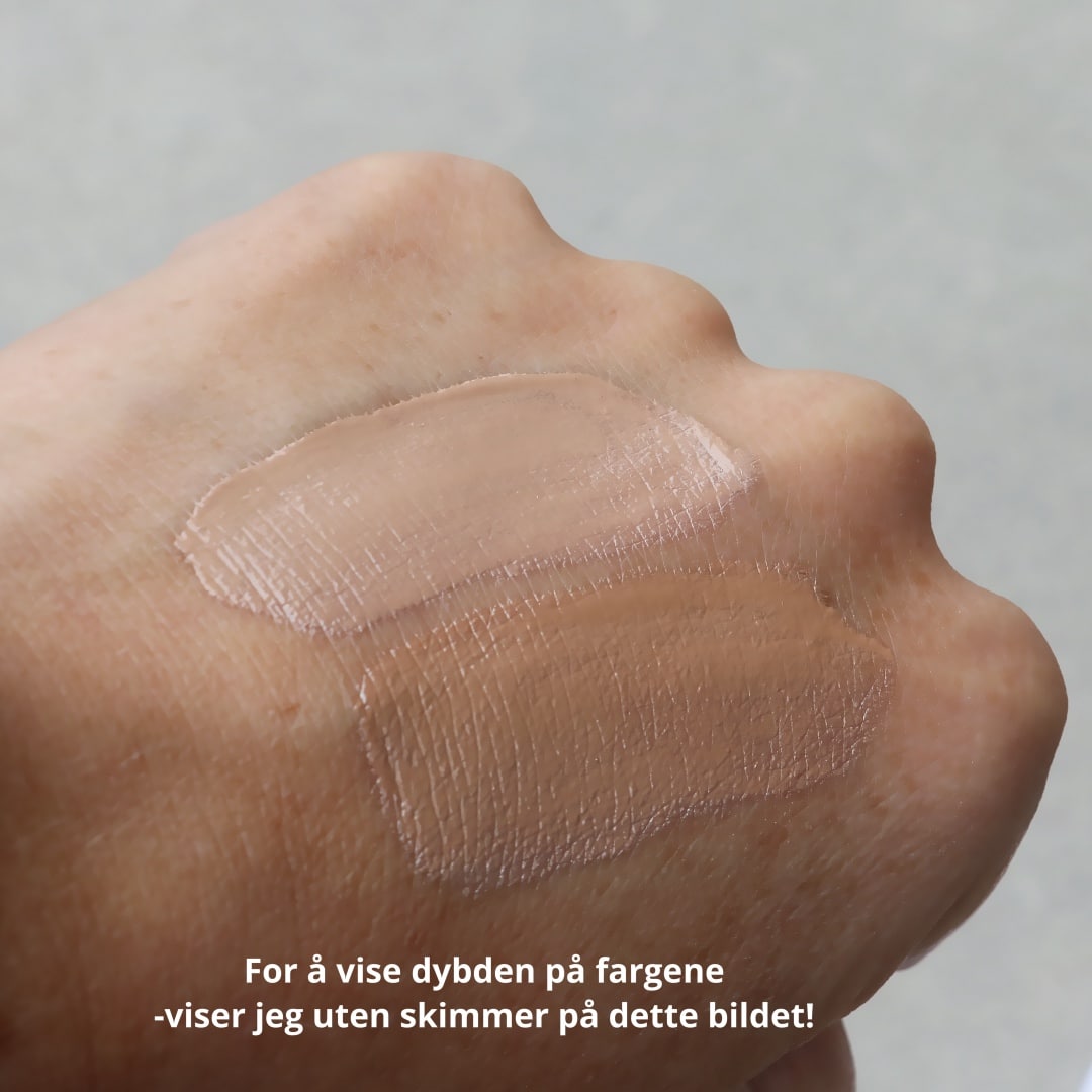 Produktet kommer i to ulike nyanser. Begge passer alle hudtoner, men farge nr. 2 har en dypere tone og gir et sterkere glødende resultat. Velg den fargen som passer din foundation og hvilket resultat du ønsker. Som en tommelfingerregel passer:
